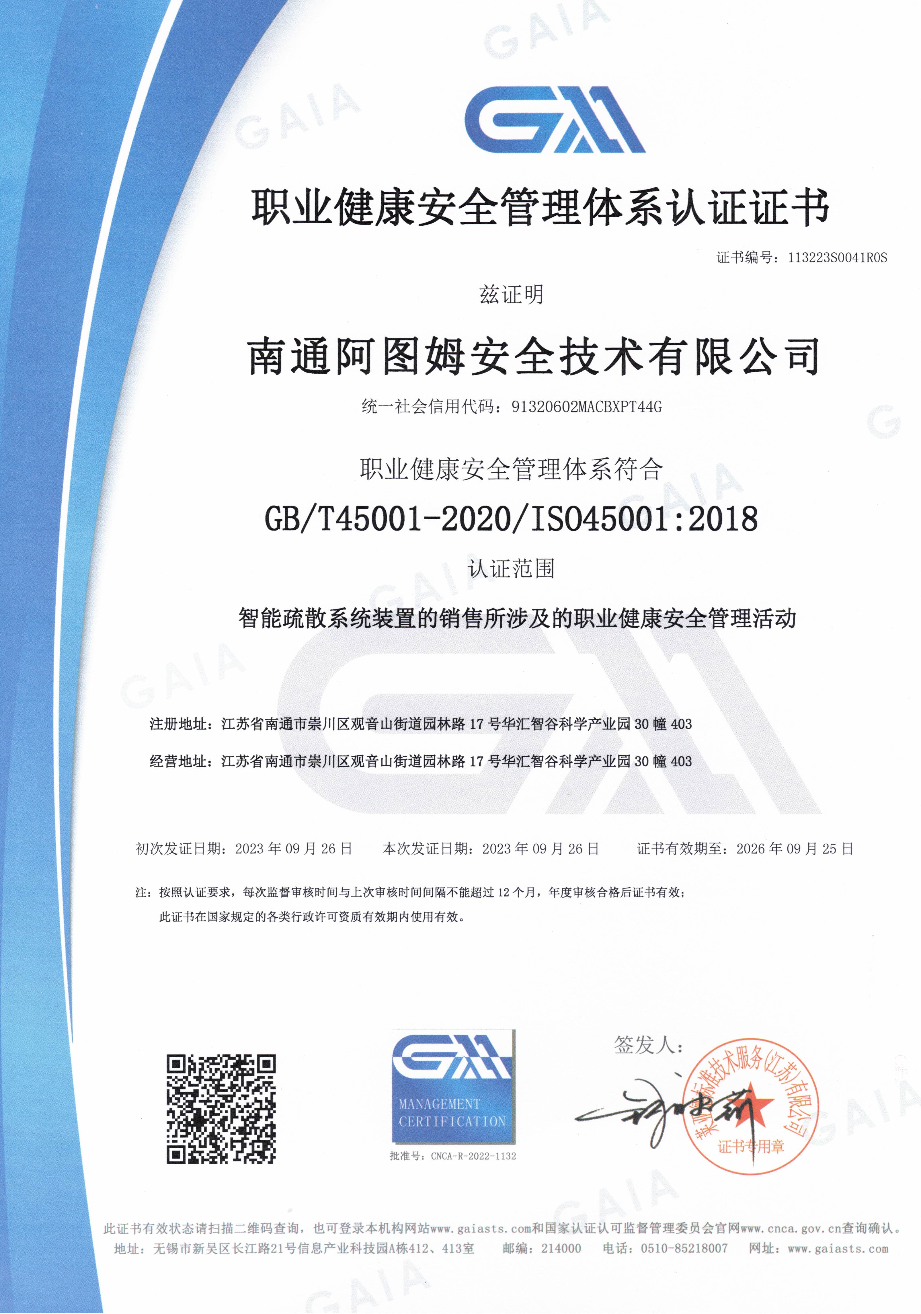 ISO职业健康管理认证证书