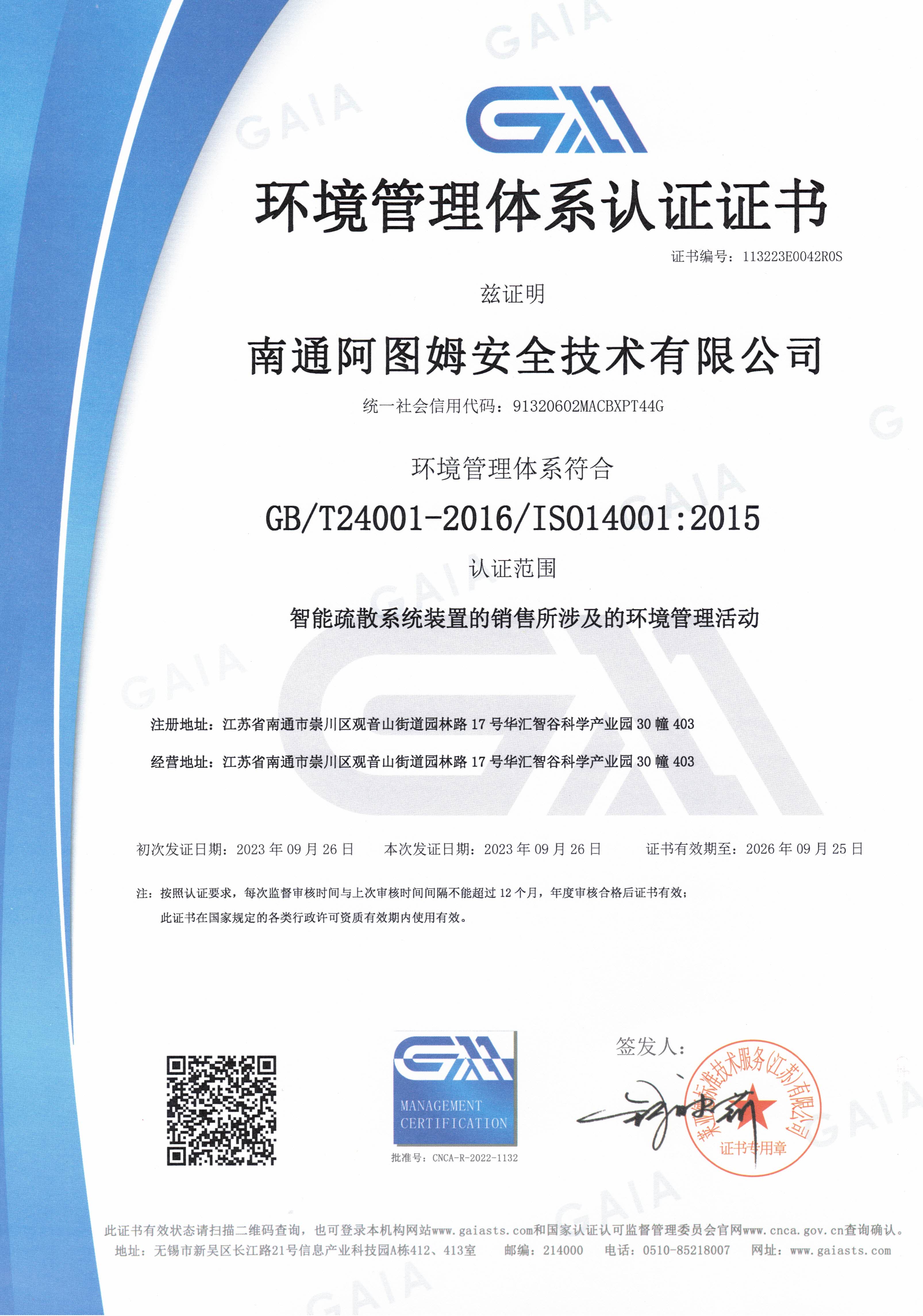 环境管理体系认证证书